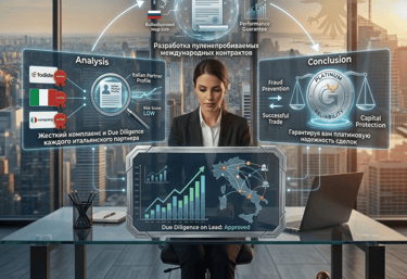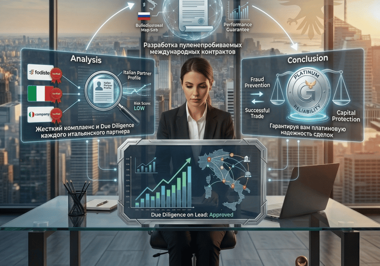 Жесткий комплаенс и Due Diligence каждого итальянского партнера. Разработка пуленепробиваемых международных контрактов, исключающих риски мошенничества и неисполнения обязательств, гарантируя вам платиновую надежность сделок.